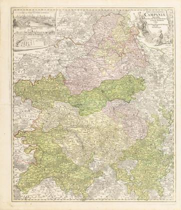 Detailreiche historische Landkarte der französischen Region Champagne, figürliche Titelkartusche "Tabula Geographica Campaniae specialis in fuas sie dictas Electiones accurate distinea [...]", Beikartusche mit Stadtansichten von Troyes und Reims