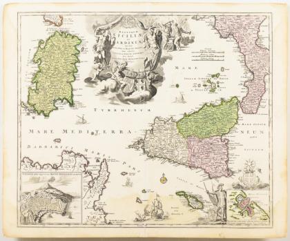 Detaillierte Karte der Inseln Sizilien, Sardinien und Malta, umgeben von Süditalien und Nordafrika, mit figürlicher Titelkartusche "Regnorum Siciliae et Sardiniae [...]", 2 Beikartuschen mit Ansicht der Festung Valletta und der Stadt Catania aus der Vogelperspektive