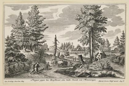 Seltene Ansicht mit Blick zwischen Baumgruppen und einem Weg mit Reisenden im heutigen Stadtteil "Straßbauer" von Memmingen, bezeichnet: "Prospect gegen den Straßbauer, eine halbe Stunde von Memmingen"