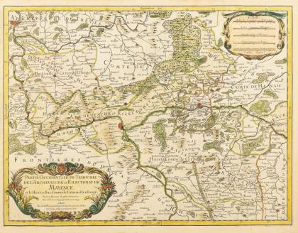 Detaillierte Karte des Erzbistums und Kurfürstentums Mainz mit der Oberen und Unteren Grafschaft Katzenelnbogen, mit reich verzierter Titelkartusche "Partie Occidentale du Temporel de l´Archevesche et Eslectorat de Mayence et le Haut et Bas Comte de Catzenellenboge. Tirés des Memoires les plus nouveaux. Par le Sr. Sanson, Geographe Ordinaire du Roy A Paris, Chez H. Jaillot [...] 1681", Kartusche mit Meilenzeiger