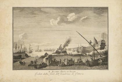 Ansicht des Hafens von Toulon in Frankreich, bezeichnet "Il Vecchio Porto di Tolone / veduto dalla Parte dell'Academia di Pittura", nach einer Zeichnung von Claude Joseph Vernet (1714 - 1789)