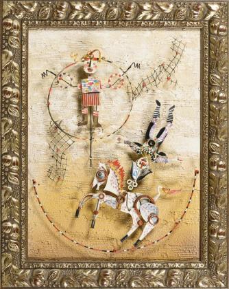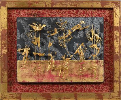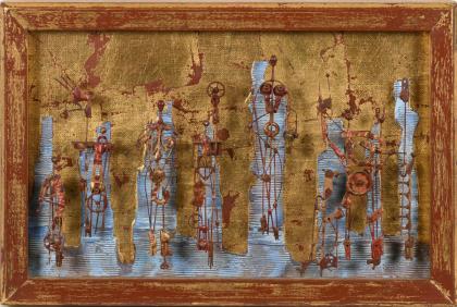 Vor dem Gemälde mit 3 verzierten Bäumen schwebende Figuren