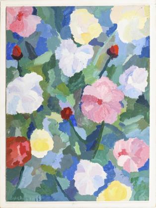 Expressiv gemalter Wiesenstrauß in blauer Kanne