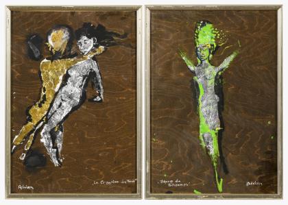 Zwei innig verschlungene Figuren bzw. eine Frauenfigur mit erhobenen Armen