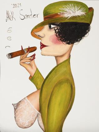 Comic-ähnlich und naiv gemalte Frau im Profil mit Hut und Zigarre
