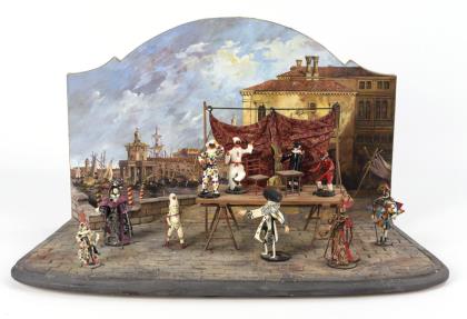 Gepflasterter Platz vor realistisch gemaltem Palazzo mit Blick über den Canal Grande zur Punta della Dogana. Auf der erhöhten Bretterbühne 2 fest installierte Figuren beim Theaterspiel; die restliche Figuren sind frei beweglich