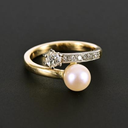 Ring mit Zuchtperle, Altschliffbrillant und Diamanten.