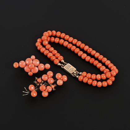 2-reihiges Korallenarmband und 2 Broschen, um 1900.