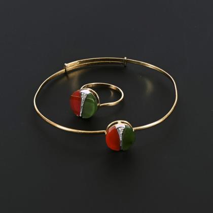 Armreif und Ring mit Jade, Karneol und Diamanten.
