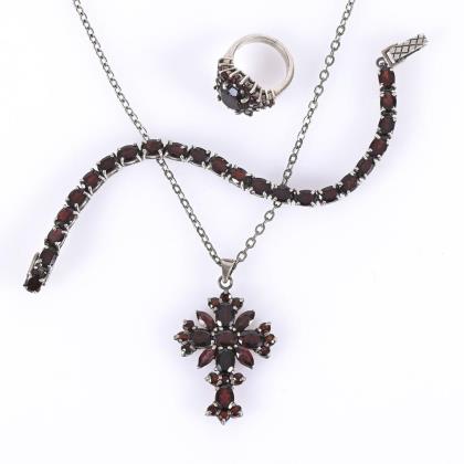 Armband, Anhänger und Ring mit massiv gefassten Granaten. Klippverschluss, Ankerkette mit Ringfederschließe, mittlere Schiene