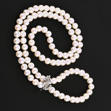 Durchgehende Schnürkette mit Zuchtperlen in Einzelverknotung. Zierklipp besetzt mit 8 kleinen Brillanten und 7 Diamanten. Klippmechanik mit Achtersicherung