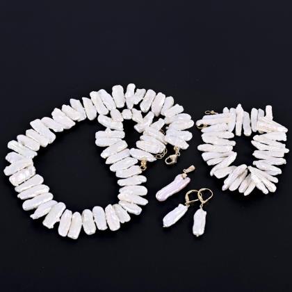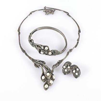 Kette, Armband, Anhänger und Ohrhängerpaar mit Zuchtperlen.