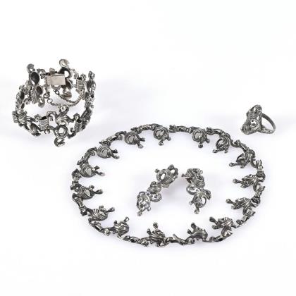 Halskette, Armband, Ring und Ohrklipp-Paar mit reliefierten Ornamentgliedern. Hakenverschluss, Kastenschließe, mittlere Schiene und Klippmechanik
