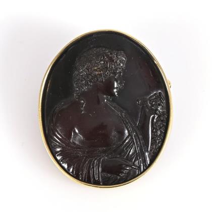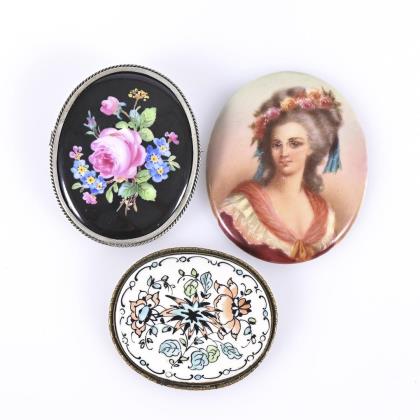 Ringbrosche mit krappengefassten und abgehängten Glassteinen. Brosche mit Tigeraugencabochons in offenen Zargenfassungen. Ringfederschließen
