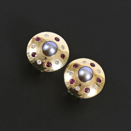 Ohrsteckerpaar mit Zuchtperlen, Brillanten und Rubinen.