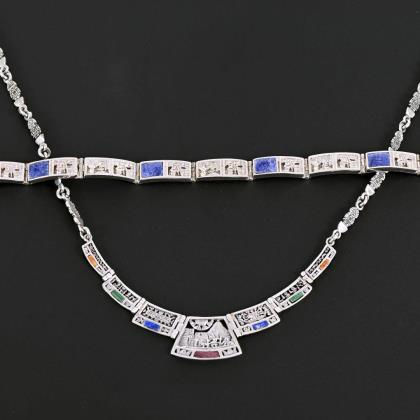 Collier mit reliefierten Gliedern. Mittig kleine, eingelassene Steinsegmente (u.a. Malachit, Lapis und Achat), an Karabinerschließe. Armband mit reliefierten Schau- und Rückseiten und 4 zargengefassten Sodalit?einlagen, an Kastenschloss mit Achtersicherung