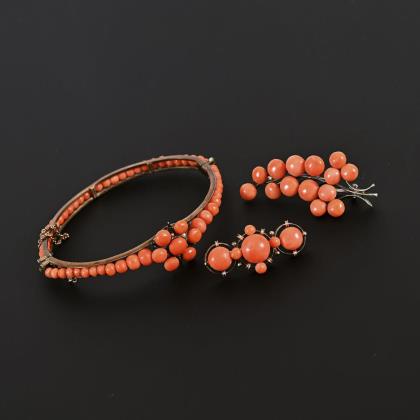 Korallenarmreif und 2 Broschen, um 1900.