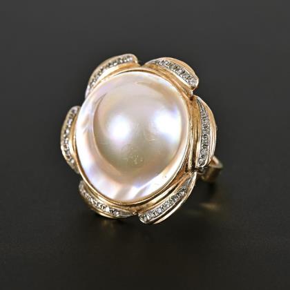 Ring mit großer Mabézuchtschalenperle und Diamanten.
