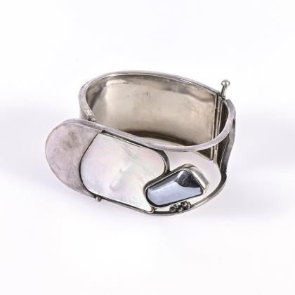 Breiter Reif mit zargengefasstem Hämatitcabochon und Perlmutteinlage. Stiftverschluss