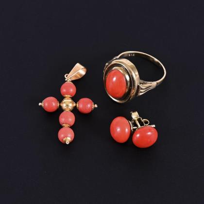 Ring, Ohrsteckerpaar und Kreuzanhänger mit Korallen. Schmale Schiene, Steckmechanik