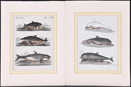 11 kolorierte Tafeln mit Fischen, aus "Allgemeine Naturgeschichte der Fische" von Marcus Elieser Bloch, Berlin, ca. 1784: Tafel 19 - Entwicklung des Fisches, Tafel 75 - "Der Sandaal", Tafel 158 - "Der Spitzschwantz", Tafel 171 - "Der Schifshalter", Tafel VII, Tafel XIV, Tafel XV, Tafel XXIII, Tafel XLIV, Tafel XXXIX und Tafel LVI; dazu 2 kolorierte Illustrationen mit Heringen und Rochen aus dem 19. Jh