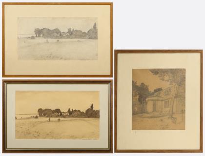 Gerahmte Bleistiftzeichnung "Salzachstrasse 2" (Rahmen: 32 x 28 cm), 2 gerahmte Ansichten von Hohenferchesar, davon 1x Tuschzeichnung, datiert "16.VI.51" und signiert (Rahmen: 35 x 52 cm) und 1x Bleistiftzeichnung, datiert "16.VI.51" und signiert (Rahmen: 32 x 46,5 cm), etwas stockfleckig; Mappe mit 7 Briefen des Künstlers aus den 1940er und 1950er Jahren, davon 5 mit Landschaftsaquarell, 1 mit Damenbildnis und 1 mit Darstellung einer Grabstätte; Aquarell mit Ruinenlandschaft "Casa Giollaro am Monte Corro 4.5.1939" und Aquarell mit Berglandschaft (unleserlich betitelt, 30.8.1939) sowie 18 Blättern mit Bleistiftskizzen aus den 1920er Jahren mit Landschaften, Skizzen knickspurig, Löcher in den Ecken durch Pin-Befestigung, teils etwas fleckig