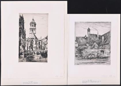 "Die Frauenkirche in Dresden", Radierung, Bleistiftsignatur, Platte: 24 x 14 cm, Blatt: 26,5 x 36,5 cm, Exemplar: 5/100, in der Platte datiert: 1919, Nr. 2930 | "An der Klostermauer in Königsberg i. d. Neumark", Radierung, Bleistiftsignatur, Platte: 21 x 17,2 cm, Blatt: 30 x 23 cm, Exemplar: 4/100, Nr. 2945