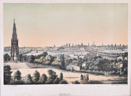 Biedermeierliche Ansicht mit Blick auf Berlin vom Kreuzberg aus, im Vordergrund Staffagefiguren und Kreuzbergdenkmal