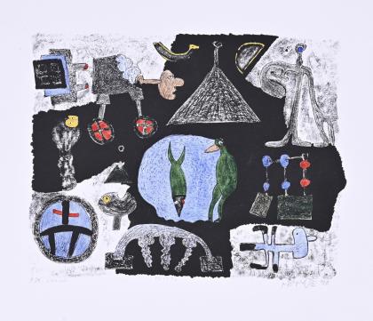 "Nachtgesicht", Holzschnitt auf Japanpapier, Stock: 21 x 15 cm, Blatt: 29,5 x 23 cm, Exemplar: "E.A." - Künstlerexemplar, Bleistiftsignatur, oberer Rand knickspurig | "König im Fadenkreuz", Aquarell und Tusche, Blatt: 10 x 14,5 cm, verso Stempel "Ulrich Tarlatt", verso betitelt, datiert: 23.8.82 und signiert | "Gott Teufel Hommage August Walla", Farboffsetdruck, Blatt: 26 x 21 cm