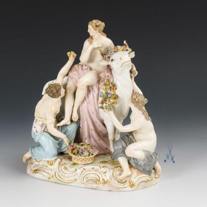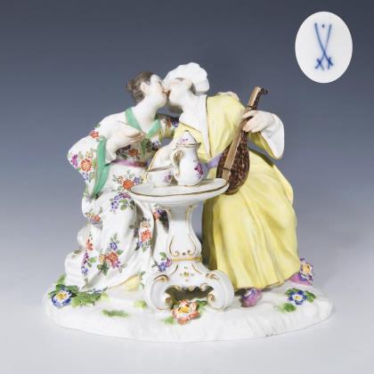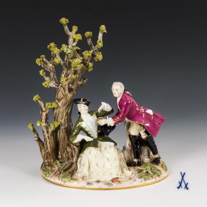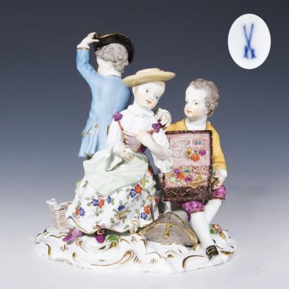 Modell von Johann Joachim Kaendler 1757. Aus einer Serie von 4 Figurengruppen. Farbig bemalt, gold staffiert. Ritzmarke, Malermarke, Schwertermarke