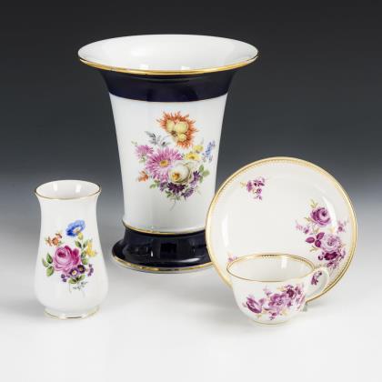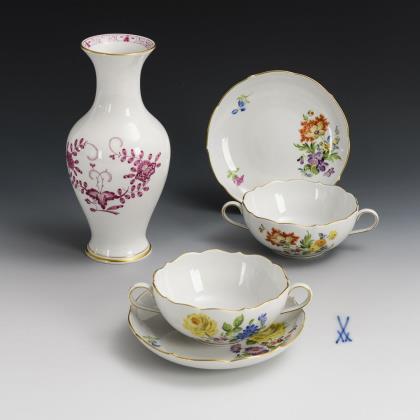 Balustervase mit Purpurmalerei (H 23,5 cm), 2 Suppentassen (H 5,5 cm) mit 2 Untertassen (Ø 16,5 cm) mit farbiger Blumenmalerei, goldgerändert