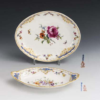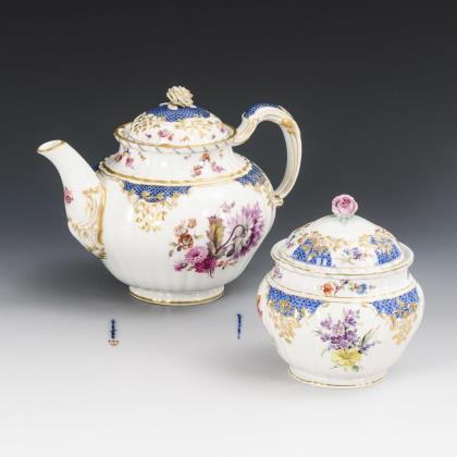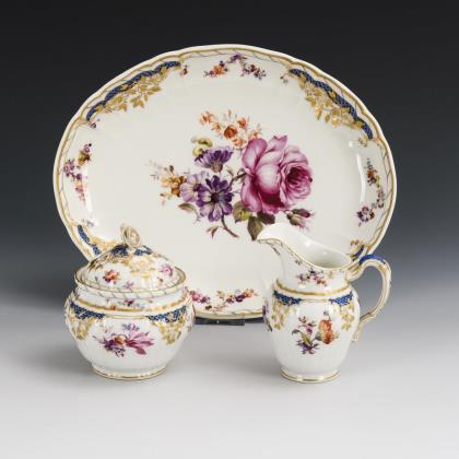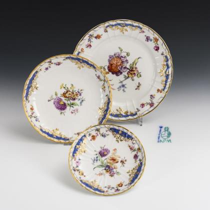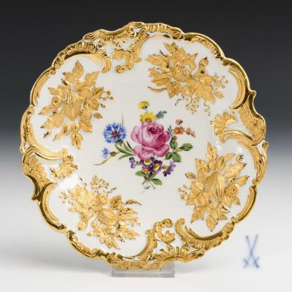 Rokoko-Form. Form-Modell von Julius Mantel 1872. Nach seinem ersten Auftraggeber, dem König von Bayern, wird das Service auch "Bayrisches Service" genannt. Reliefiert, gold staffiert. Im Spiegel großflächig gemalte farbige Blüten. Malermarken, Pressmarken, rote Reichsapfelmarke, blaue Zeptermarke