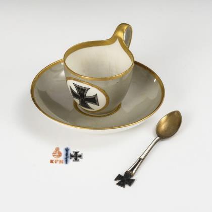 Campanertasse mit grauem Fond, schauseitig ein goldgerahmtes Medaillon mit dem Eisernen Kreuz. Dazu Metalllöffel mit schwarz-weißer Emaillierung und einem Eisernen Kreuz
