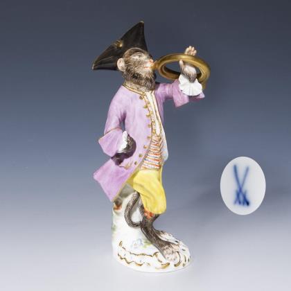 Figur der Affenkapelle: Affe als Waldhornist. Meissen.