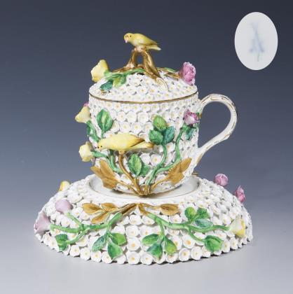 Modell von Johann Joachim Kaendler 1740. Die gesamte Außenwandung mit gelb staffierten Blüten belegt. Umlaufend plastisch aufgelegte, naturalistisch bemalte Blütenzweige und Vögel. Blätter partiell mit Goldfond, goldradiert. Untertasse farbig bemalt "Streublumendekor", Goldstaffage. Schwertermarken