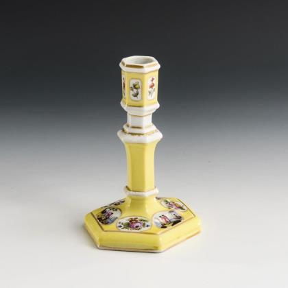 Sechseckiger Leuchter mit mehrfach gegliedertem Schaft und Tülle. Gelber Fond mir sechs Ovalkartuschen, darin alternierend Kauffahrteimalerei und Blumenbuketts