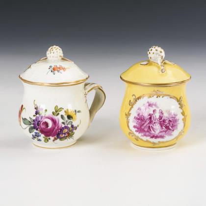 Bauchige Tassen mit gekreuztem Bandhenkel und Fruchtknaufdeckel. 1x mit gelbem Fond und einer purpurfarben gemalten Watteau-Szene in einer Rocaillekartusche. / 1x mit Blumenmalerei