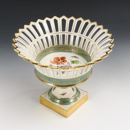 Korb mit Stabdurchbrüchen und gezacktem Rand, Rundfuß, auf Quadratplinthe. Mit vegetabiler Goldmalerei auf türkisfarbenen Fondbändern, im Spiegel des Korbes ein Blumenbukett mit Insekten