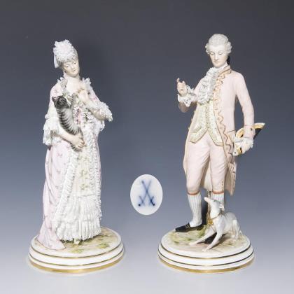 Paar Figuren: Dame mit Katze, Kavalier mit Hund. Meissen.