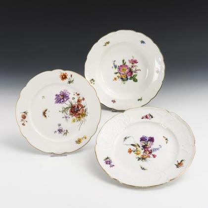 1x Suppenteller Modell "Neuglatt. / 1x Speiseteller Modell "Reliefzierat mit Spalier". / 1x Frühstücksteller mit passigem Rand