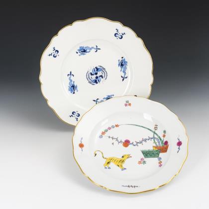 Form "Neuer Ausschnitt". 1 Speiseteller mit dem Dekor "Gelber Löwe" und 1 Platzteller mit blauem Drachendekor
