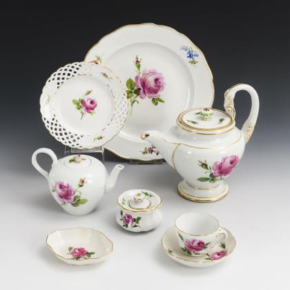 56+1 Teile. Form "Neuer Ausschnitt". Kaffeekanne (H 24,5 cm), Teekanne, Milchkännchen, Zuckerdose, 12 Tassen mit 12 Untertassen, 12 Kuchenteller, 1 Kredenzteller, 2 Mokkatassen mit 2 Untertassen, 7 Vierpassschälchen (L 10,5 und 19 cm), 2 Ascher, 1 Blattschälchen, 1 Untertasse (Form "Großer Ausschnitt"). Dazu 1 Kaffeekannendeckel