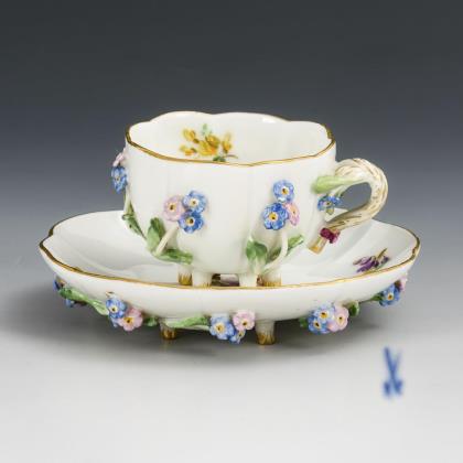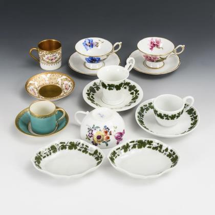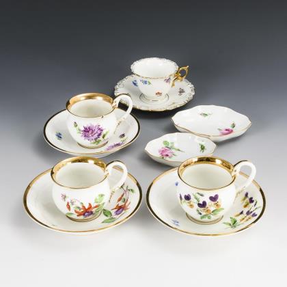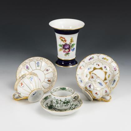 1x Meissen, um 1770: bauchige Tasse mit Blumenmalerei. / 6x verschieden gemarkt, 20. Jh. (KPM Berlin, Meissen, Tettau, Limoges): verschieden bemalt (Weinlaub, türkiser Farbfond, Blumenmalerei), alle mit Untertassen. / 2 Vierpassschälchen Meissen mit Weinlaubdekor