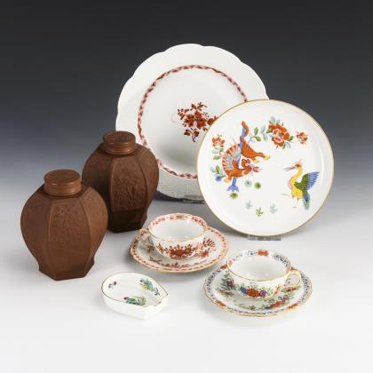 2 Teedosen Böttger-Steinzeug mit Blumen- und Vogelrelief (H 12 cm), 1 Frühstücksteller "Altozier" (Ø 21 cm), 2 Mokkatassen "Neuer Ausschnitt" mit 2 Untertassen, 1 hufeisenförmiger Ascher und 1 Teller mit Drachen und Storch (Ø 17,5 cm)