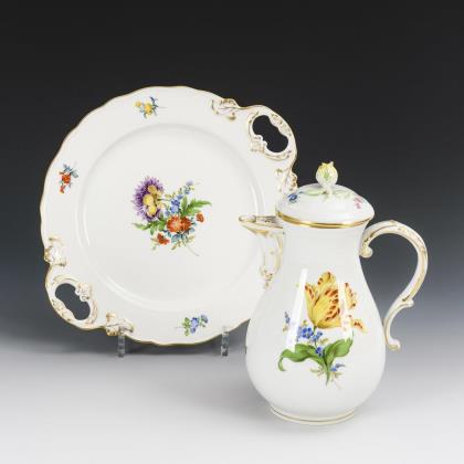 Kanne und Kuchenteller mit Blumenmalerei. Meissen.