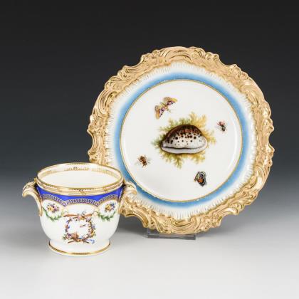 1x Teller mit floral-ornamentalem Reliefrand, im Spiegel die Darstellung einer Kaurischnecke, umgeben von Insekten. / 1x Cachepot mit zwei Rocaillehandhaben, blauem Teilfond und polychromer Blumen- und Vogelmalerei