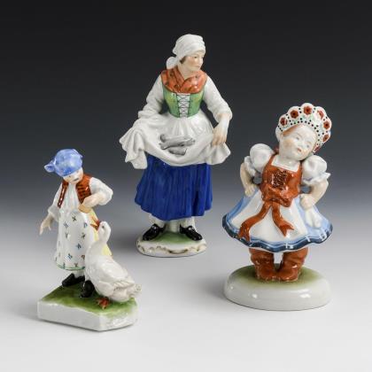 1x Fischverkäuferin, Modell-Nr. 5703 (H 24,5 cm). / 1x tanzendes Mädchen, Modell-Nr. 5423 (H 20 cm). / 1x Bauernmädchen mit Gans, Modell-Nr. 5545 (H 17 cm)