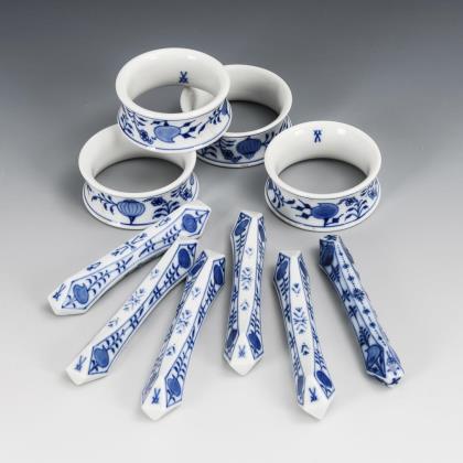 6 Zwiebelmuster-Messerbänkchen und 4 -Serviettenringe. Meissen.