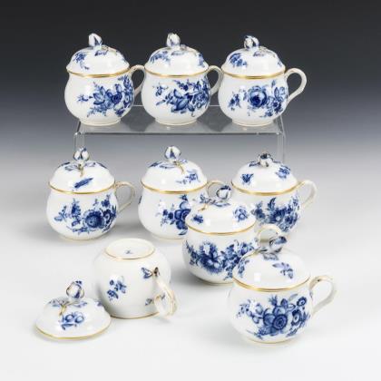 9 Crèmetöpfchen mit Blaumalerei. Meissen.