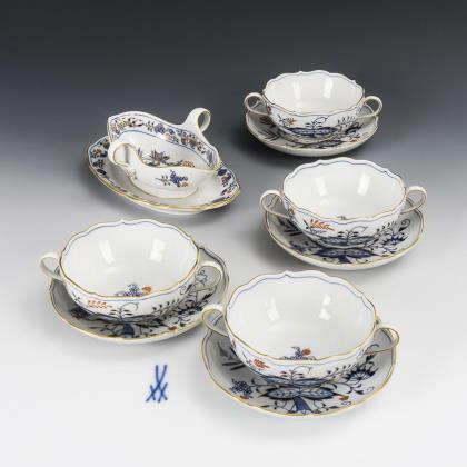 4 Zwiebelmuster-Suppentassen und 1 -Sauciere. Meissen.